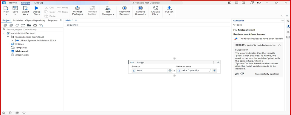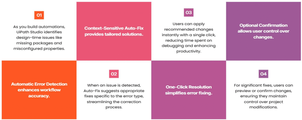 Auto-Fix acts as a built-in development assistant within UiPath Studio, intelligently detecting common design-time issues and offering smart, context-aware suggestions to resolve them—often with just a single click. It helps streamline the debugging process, reduce manual intervention, and boost overall development productivity.
