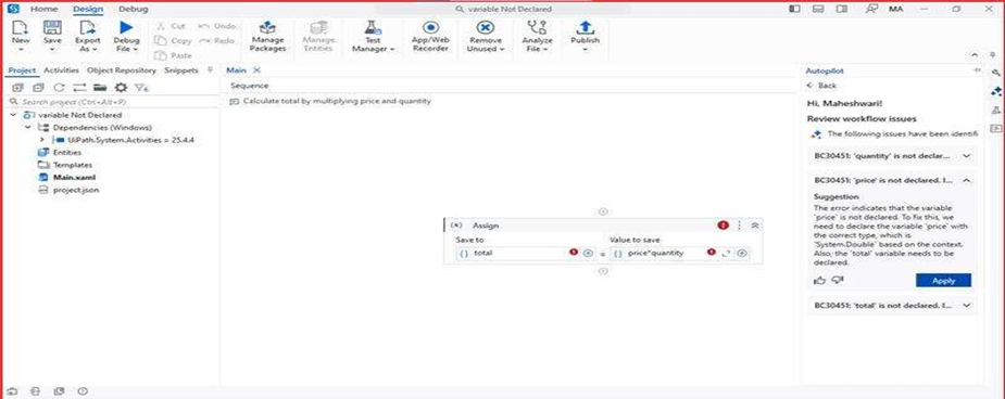 Think of Auto-Fix as a real-time coding assistant that not only flags issues but also guides you through fixing them, or better yet, does it for you. It ensures your workflow remains clean, executable, and aligned with UiPath’s best practices.
