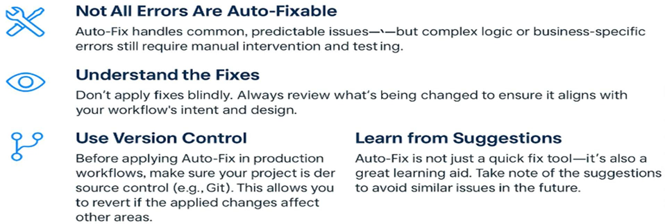 While Auto-Fix in UiPath Studio is a valuable productivity tool, it’s important to use it with care and understanding. Not every issue can be resolved automatically—complex logic errors or business- specific configurations may still require manual correction. Developers should always take a moment to review and understand the changes suggested by Auto-Fix to ensure they align with the workflow’s purpose. It’s highly recommended to use version control systems like Git before applying any automated fixes, so you can safely track or revert changes if needed. Additionally, Auto-Fix offers a great opportunity to learn from its context-aware suggestions, helping you avoid similar mistakes in the future. Lastly, always test your workflows after applying fixes to ensure stability and functional accuracy before deployment.
