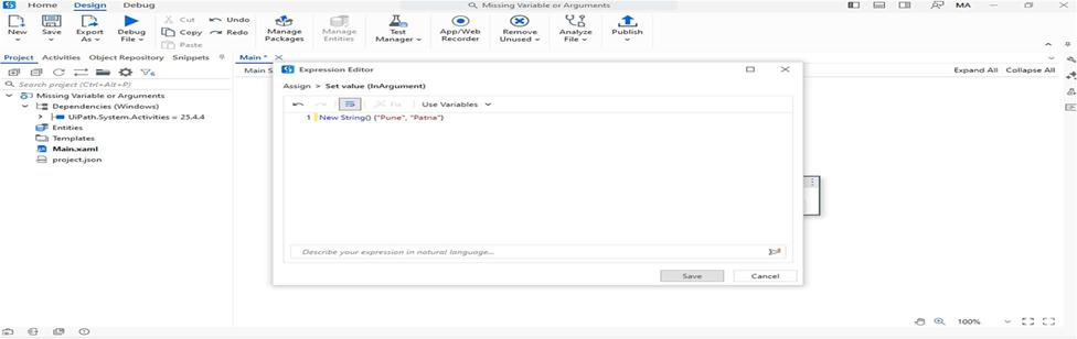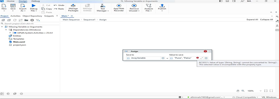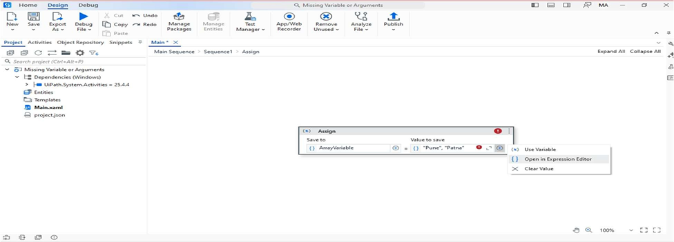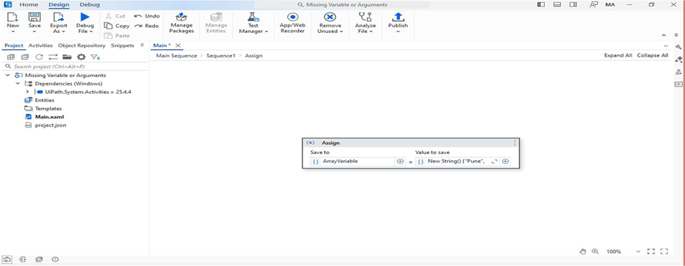 - Drag an Assign activity and assign a value to an ArrayVariable.