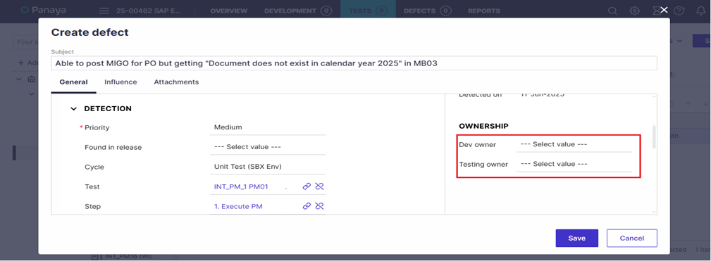 10.Under Ownership, assign the defect to the appropriate functional analyst, then click Save.