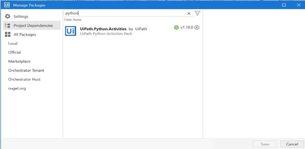 Search for UiPath.Python.Activities Install the package