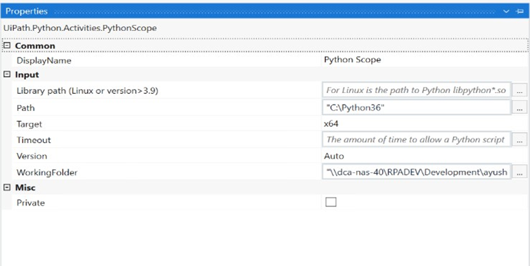 Use the Python Scope activity to initialize the Python environment. You’ll need to specify:
