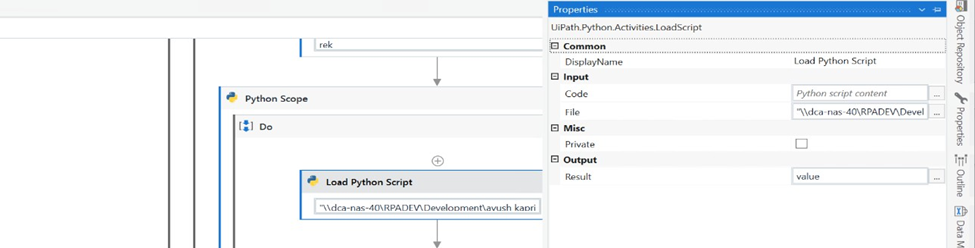 For the Input File we have to provide a python script file path which need to be executed. This activity loads the script into memory, allowing to invoke its functions later in the workflow and store the output as Variable (e.g. Value)