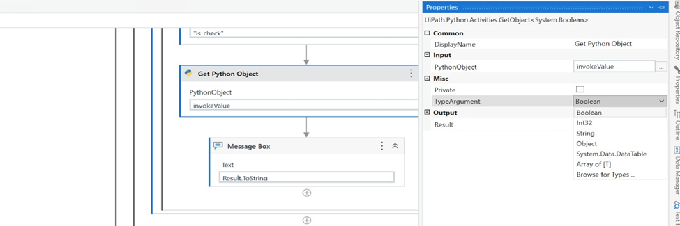 In this for input we have to take output from previous activity (i.e. Invoke Python Method) and in the type argument we have to select in which type we are getting output and store that output in another variable (e.g. Result) and then use it as per requirement