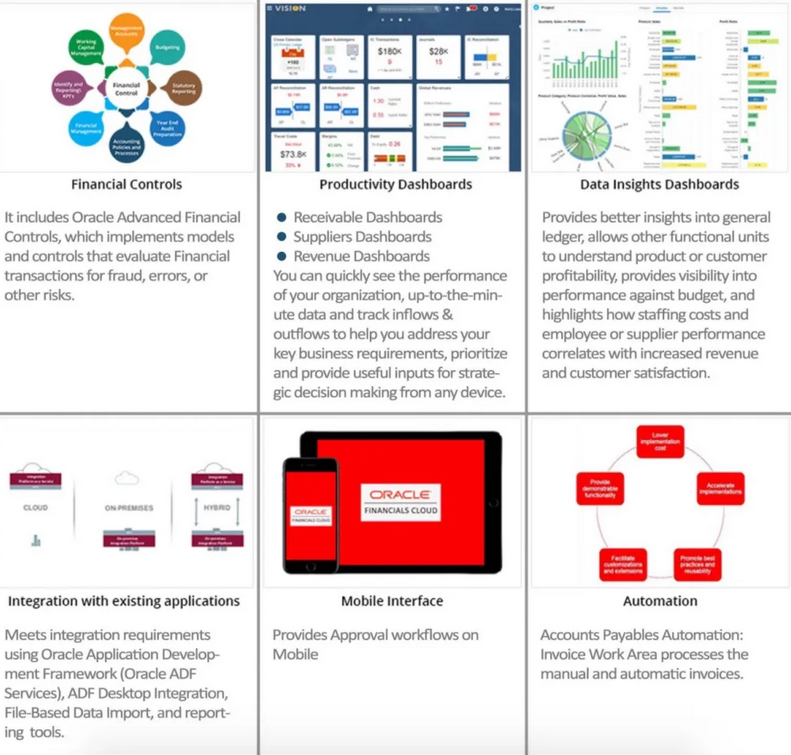 - Accessibility of Features in the Oracle ERP Financials Cloud is one of the key features. You can be accessed via the internet anywhere, anytime and works on any laptop as well as mobile devices such as smartphones and tablets. This is particularly useful when employees desire flexibility in their schedules and work environment.