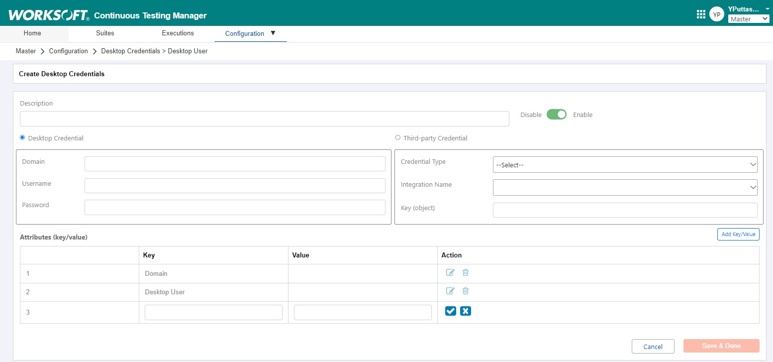 - If required can provide unique key and value in Attributes(Key/Value) section, So that same credentails can be used while creating Suites, if you have multiple login credentials.