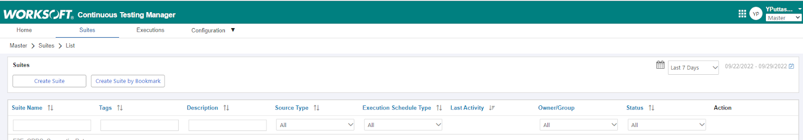 1.From the Continuous Testing Manager menu, click Suites.The Suites screen appears.