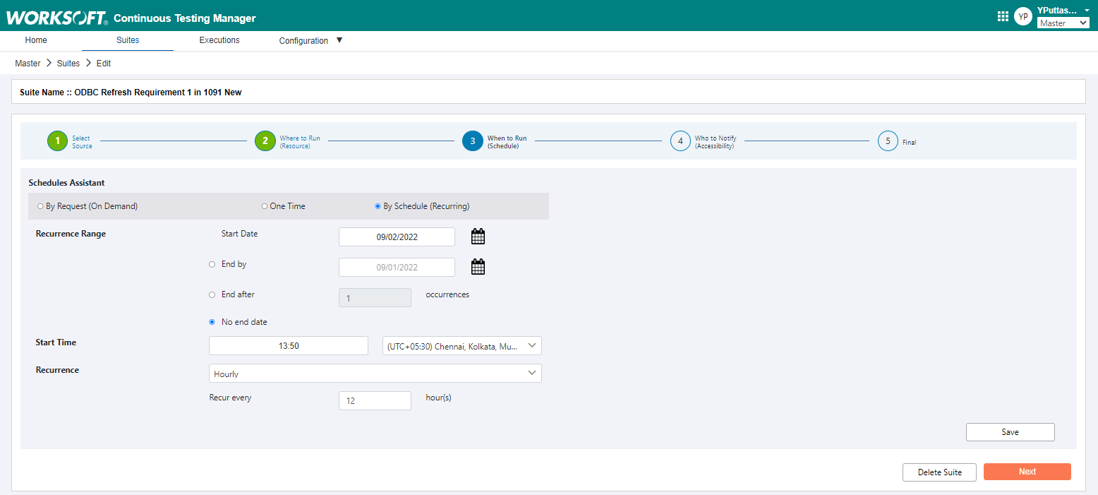 •Weekly -Enter how many times you want to execute in the week. Also, select which days you want to execute the suite.