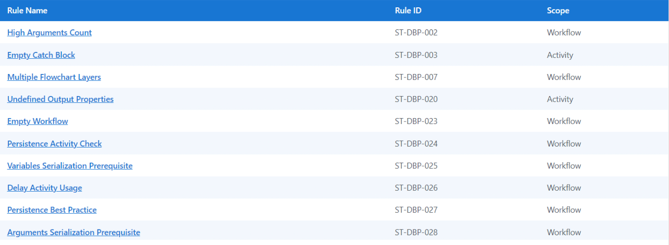 Workflow Analyzer is a static code analyzer that ensures your project meets high quality and reliability standards. When triggered, it uses the configured rule set to check the project or workflow for inconsistencies without executing the project. It logs the errors found in the Error List panel, under the rule action.