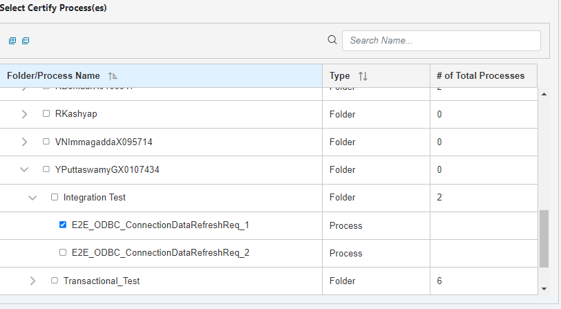 9.Process can be selected by navigating to required path by navaigating through tree structure and select checkbox so that process will be selected.Elsethrough Search field provided by giving process name as shown in below screenshot