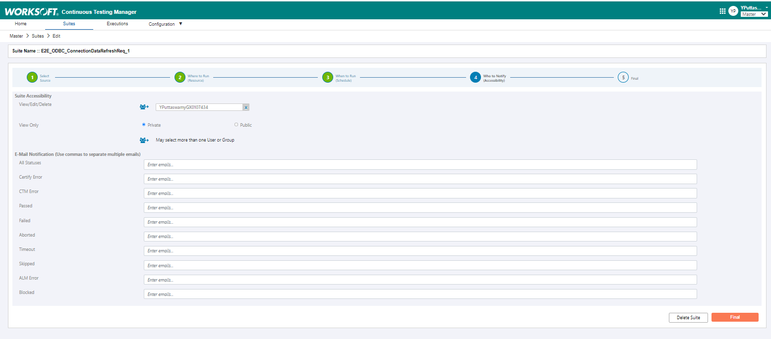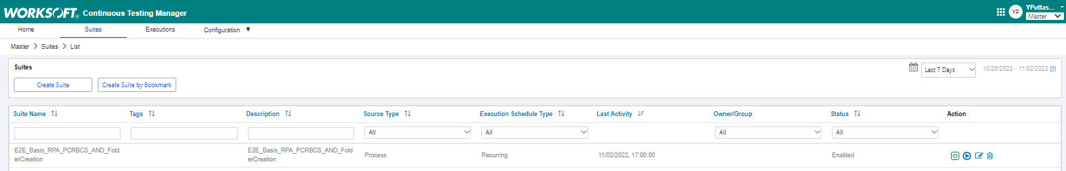 1.From the Continuous Testing Manager menu, click Suites.The Suites screen appears.