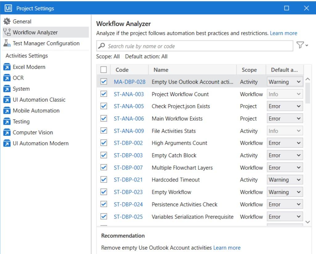 Workflow Analyzer is a static code analyzer that ensures your project meets high quality and reliability standards. When triggered, it uses the configured rule set to check the project or workflow for inconsistencies without executing the project. It logs the errors found in the Error List panel, under the rule action.